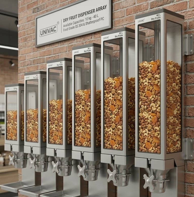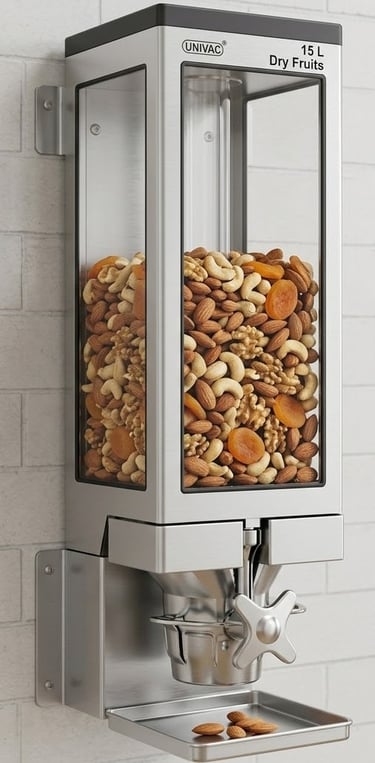 The Univac 15 L Gravity Dispenser is a premium, wall-mounted storage and dispensing solution engineered specifically for dry fruits, grains, and pulses. Constructed from high-grade SS 304 and shatterproof Polycarbonate, it combines industrial-strength durability with high-end retail aesthetics.