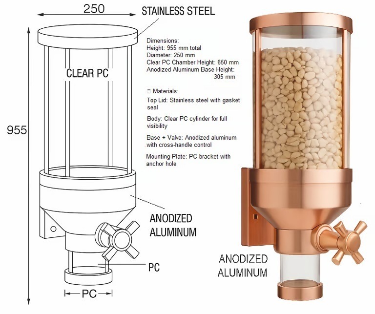 Engineered for elegance and efficiency, these wall-mounted gravity dispensers combine premium anodized aluminum with crystal-clear acrylic tubes—offering a flawless view of contents while maintaining a sleek, hygienic profile. Designed to hold 3 to 5 kilograms of dry goods, each unit delivers smooth, controlled dispensing ideal for high-traffic retail environments.