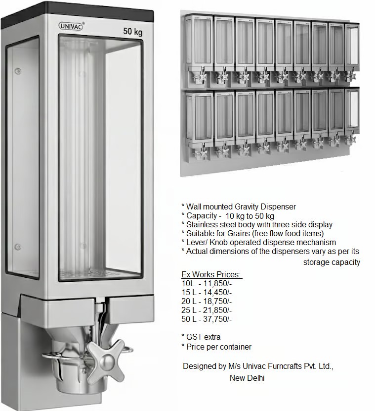 Mounted securely on the wall, these dispensers save space and keep the kitchen organized. They are easy to clean, safe for food use, and can be customized in size, finish, and mechanism to suit different needs. Whether in a Defence mess hall or a modern home kitchen, they offer a smart, hygienic, and stylish solution for bulk food dispensing..