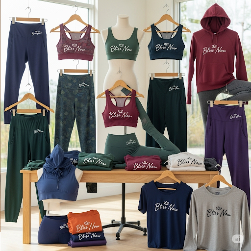 Yoga Apparel: "Bliss Now" offers a wide variety of yoga clothes. The collection includes both men's and women's apparel, featuring a range of colors, from vibrant hues like mustard yellow and maroon to more muted tones like olive green and navy blue. The designs appear to be a mix of form-fitting and relaxed styles, including leggings, sports bras, shorts, T-shirts, long-sleeved shirts, and even hoodies. The "Bliss Now" trademark is consistently and prominently displayed on the clothing, often on the waistband, chest, or hem. The overall style suggests a blend of comfort, functionality, and modern aesthetics suitable for yoga and other fitness activities.